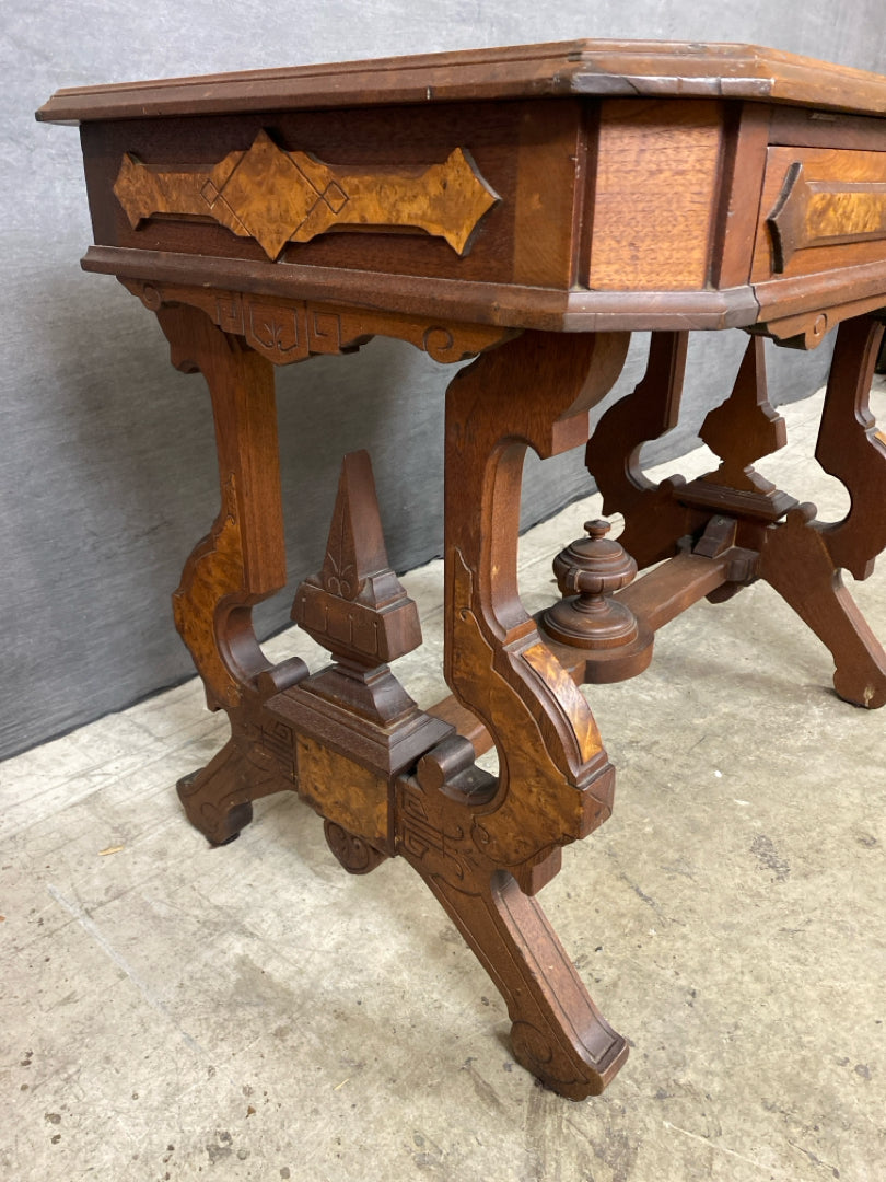 Accent Table 38x24x30" Eastlake Style Trestle Base with Burl Accents & Glass Insert Top