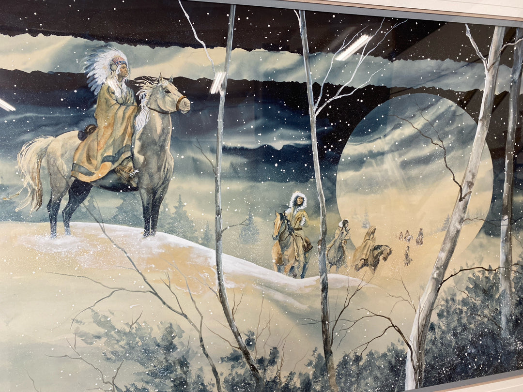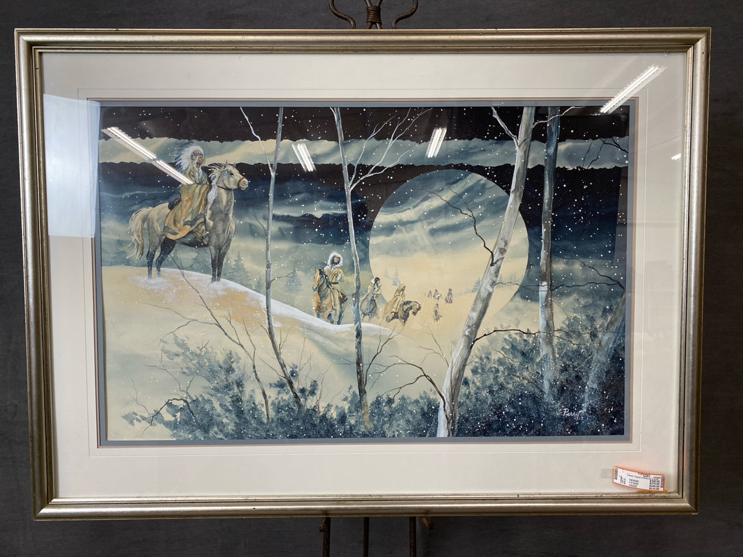 Artwork Original(?) Watercolor & Acrylic Snowy Night with Native Americans Traveling On Horseback In White Mat & Silver Frame