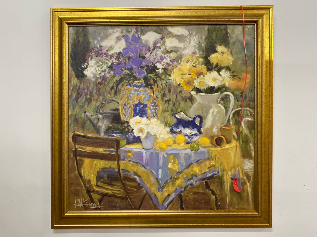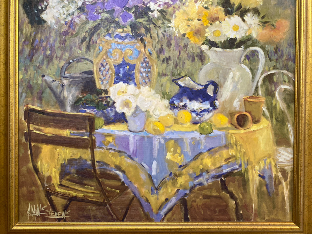 Artwork XL Canvas Acrylic Still-Life Outdoor Table Setting with Floral Arrangements In Distressed Gold Frame