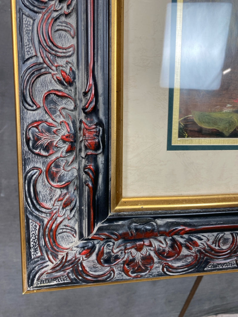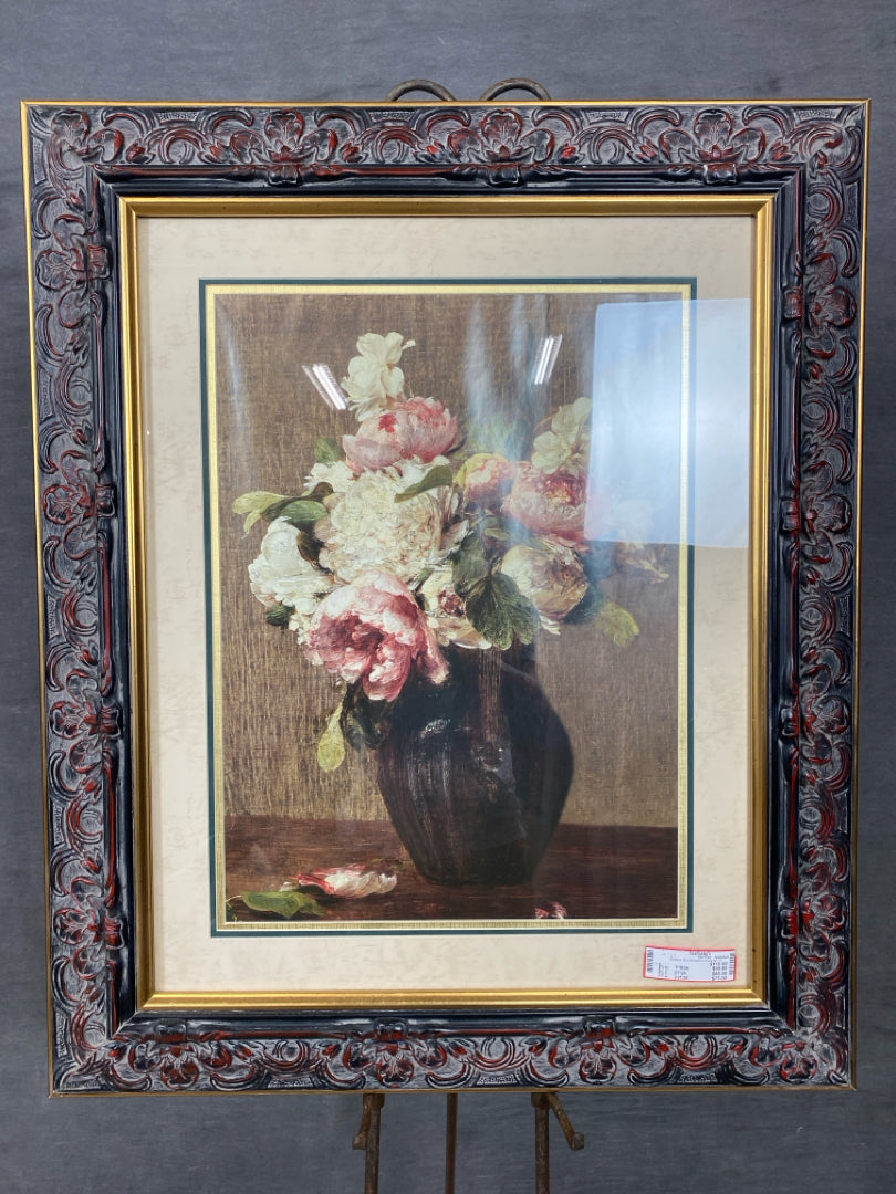 Artwork Print White/Red Floral Arrangement In Vase In Beige Mat & Black, Red & Gold Ornate Frame