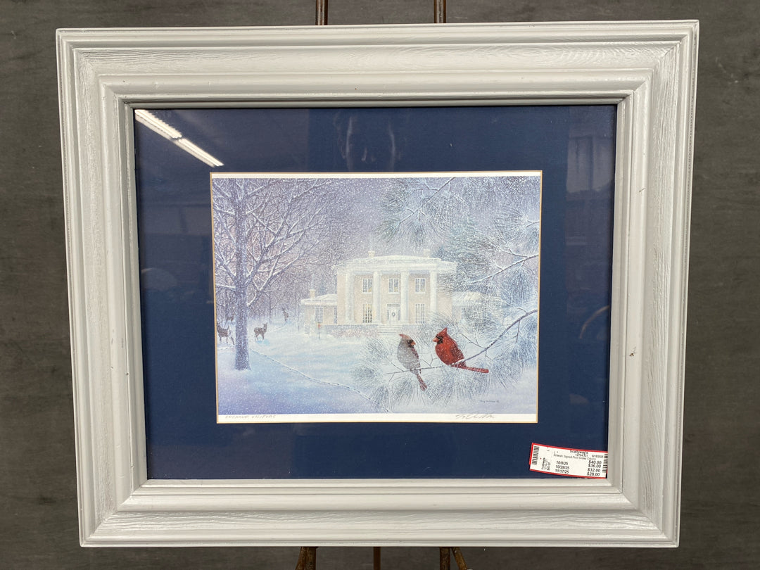 Artwork Signed Print Snowy Column House with Perched Cardinals in Blue Mat & White Frame