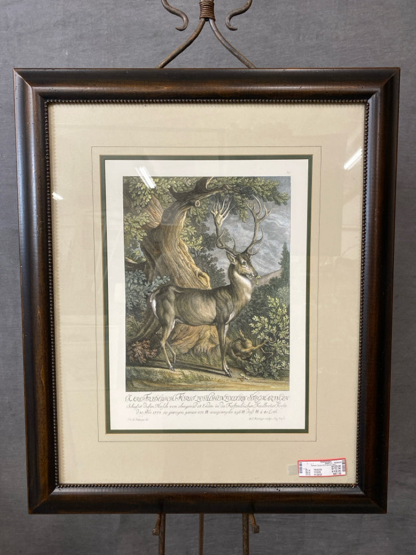 Artwork Giclee Print German Deer Bookplate In Tan Mat & Dark Wood Frame with Hobnail Trim - 2 Matching Available