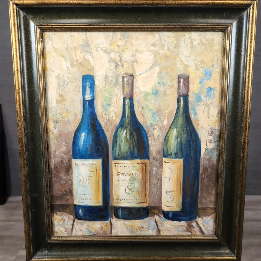 Artwork Canvas Acrylic 3 Wine Bottles Still Life In Bronze & Gold Speckled Frame