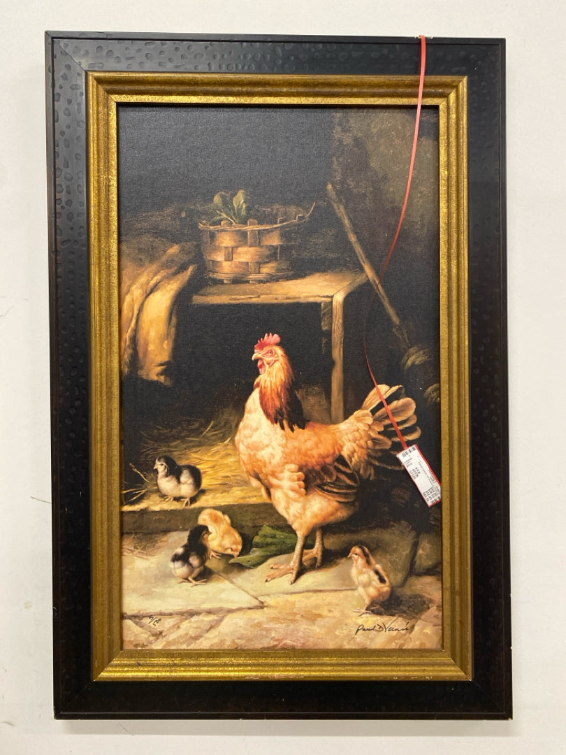 Artwork Canvas Transfer Rooster & Chicks In Dark Old World Home In Black Frame with Gold Trim
