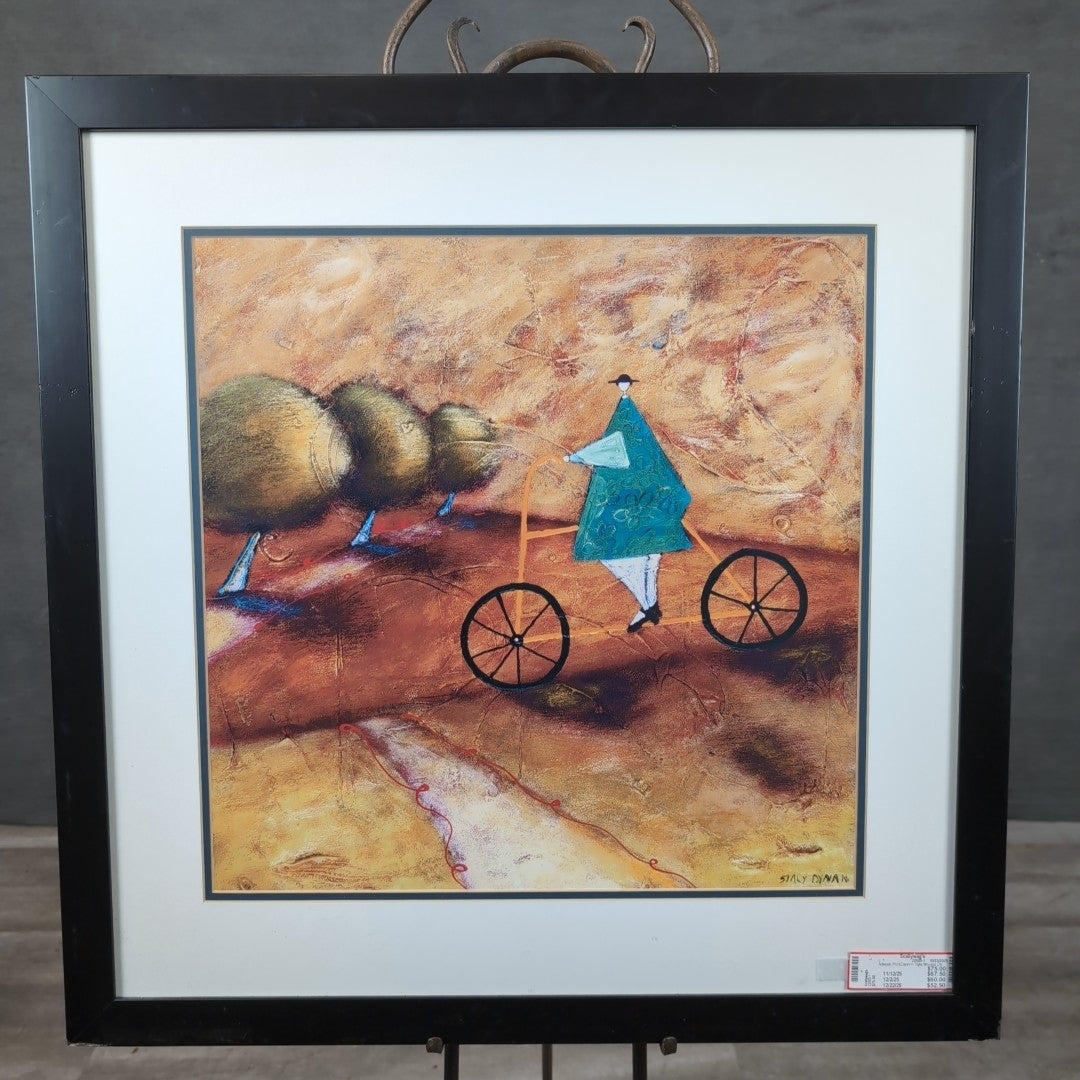 Artwork Print Cartoon Style Woman On Bicycle In White Mat & Square Black Frame "Rolling Home" By Dynan
