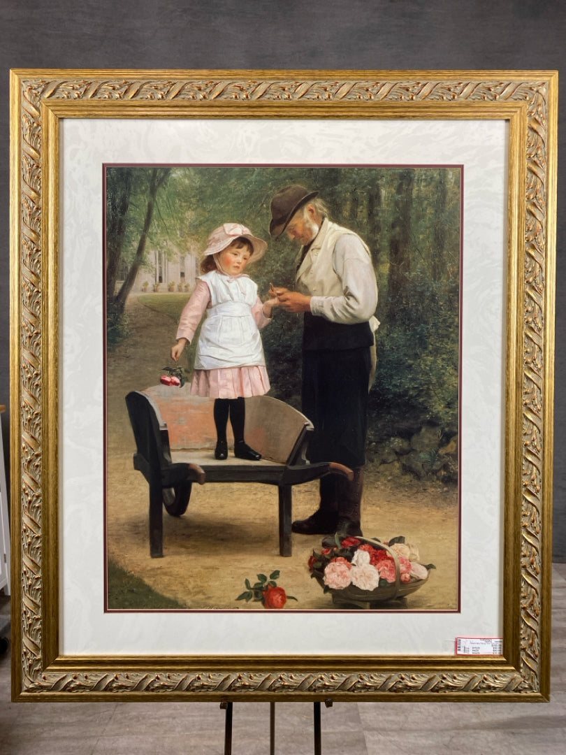 Artwork Man Picking Thorn From Girls Hand with Roses in White Mat & Leaf Pattern Embossed Gold Frame