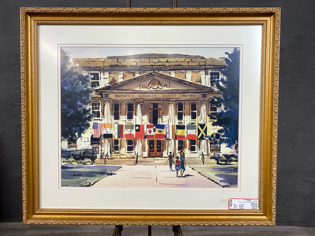 Artwork Signed & Numbered Vasilik Haywood County Court House with Folkmoot Flags in Ivory Mat & Gold Frame
