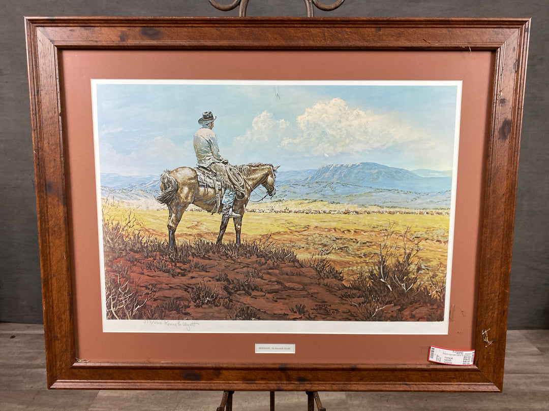 Artwork Signed/# Cowboy On Horseback Looking Across Plain With "The Bossman" Rust Color Mat Medium Wood Frame
