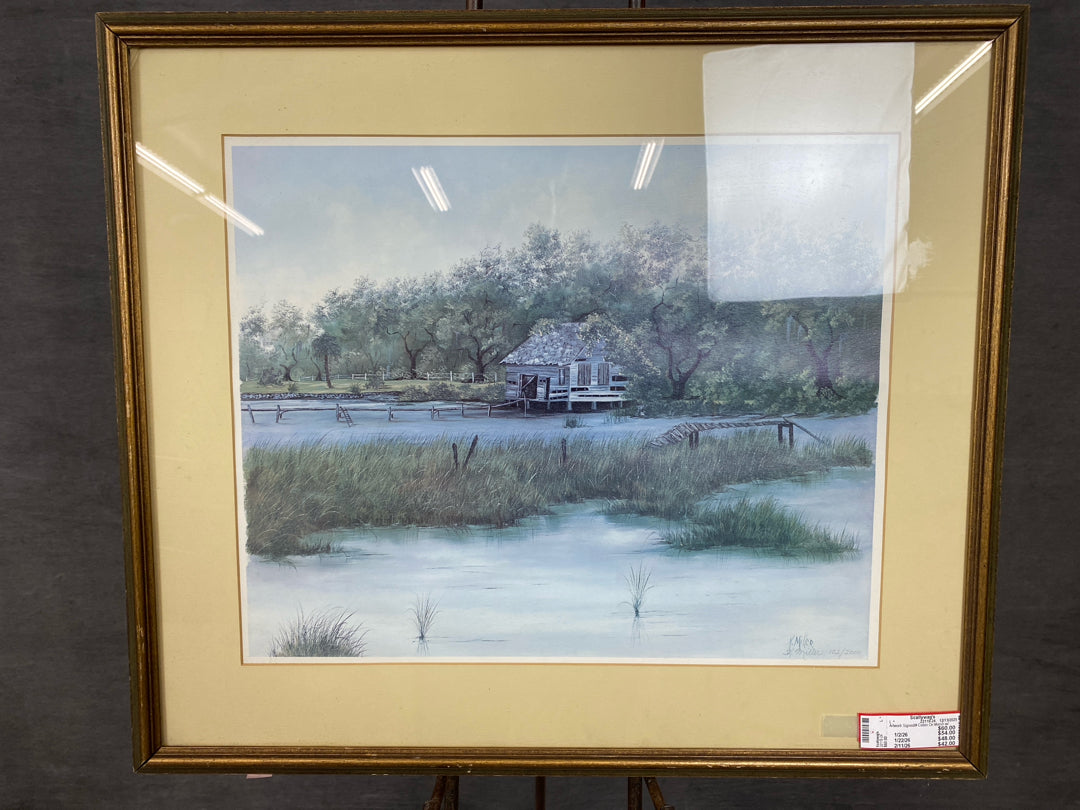 Artwork Signed & Numbered Cabin On Marsh with Trees In Tan Mat & Bronze Color Frame