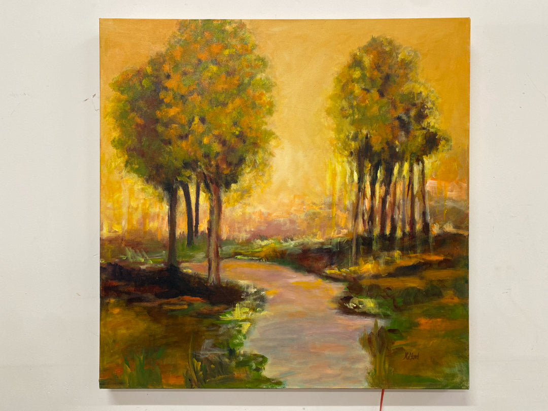 Artwork Unframed Canvas Acrylic Landscape Trees & Creek with Orange Sky