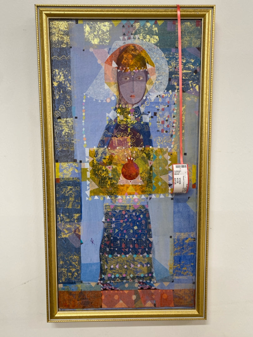 Artwork Canvas Acrylic Abstract Blue Tones Woman with Pomegranate In Gold Frame - 2 Available