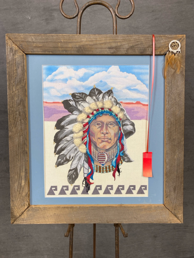 Artwork Cross Stitch Native American Head with Headdress On Landscape Background In Blue Mat & Gray Wood Frame