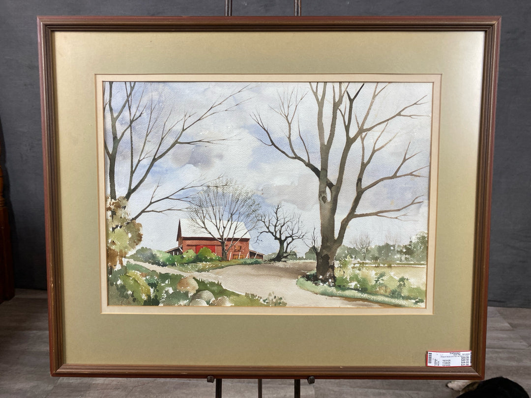 Artwork Watercolor Barn With Naked Trees In Olive Mat & Dark Wood Frame