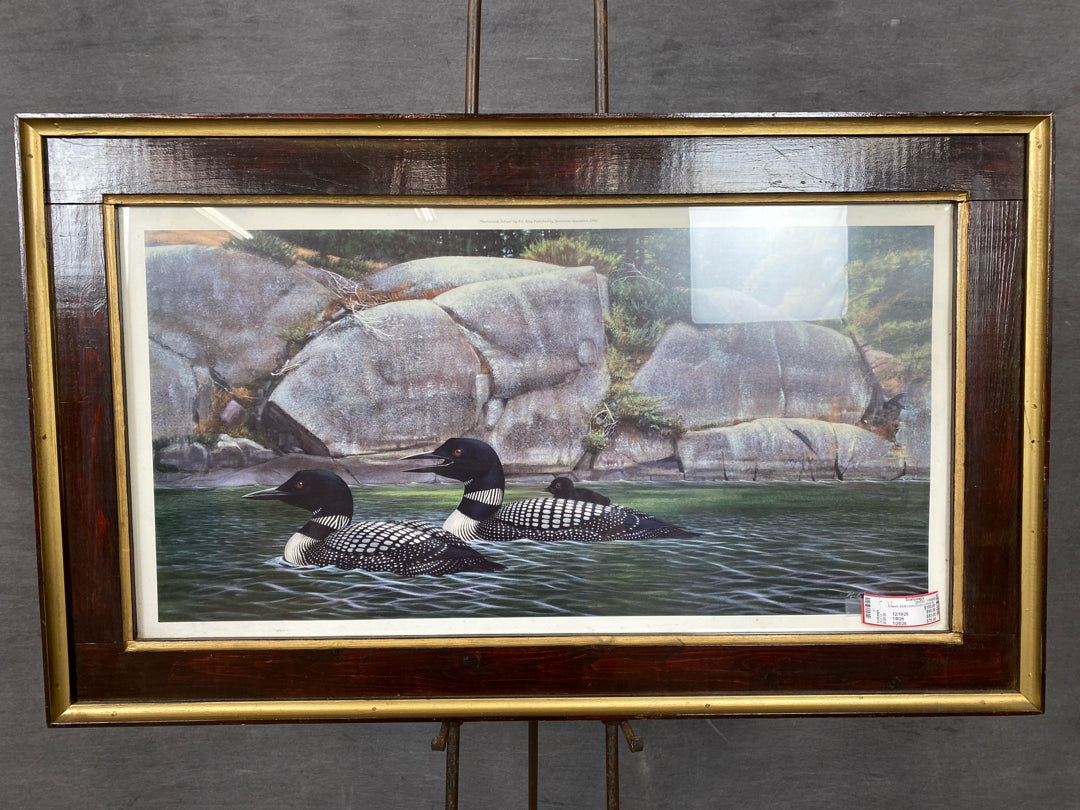 Artwork Black & White Loons/Ducks In Water By Large Rocks In Dark Wood Frame Gold Accent