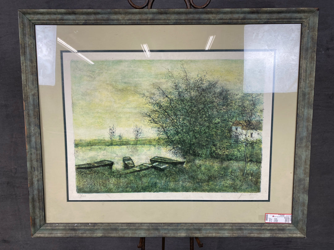 #Artwork Signed & Numbered Green Monochrome Watercolor & Ink Bushy Tree & Small Boats At Waters Edge In Tan Mat & Mottled Gray Wood Frame