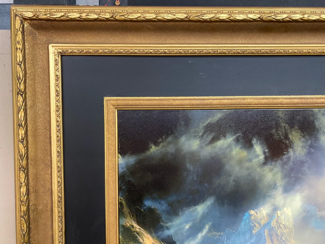 #Artwork XXL 90x70" Canvas Transfer Epic Landscape Ocean, Rocky Cliffs, Mountains & Cloudy Sky in Black & Ornate Gold Frame