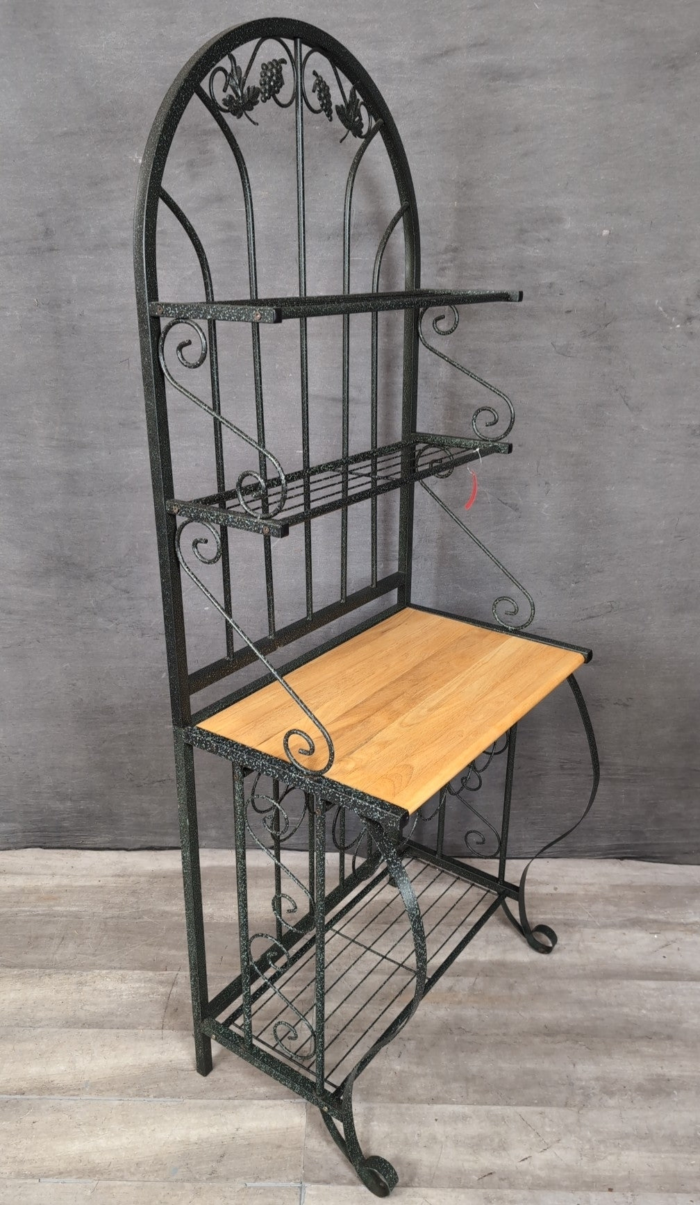 Bakers Rack 78" Tall 4 Tier Black & Green Mottled Metal Arch Top with Wood Shelf & Wine Rack