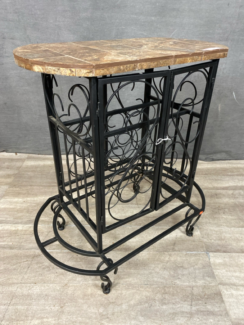 Bar Black Metal Scroll 18 Bottle Wine Rack with Faux Stone Tile Top & Foot Rest Bar