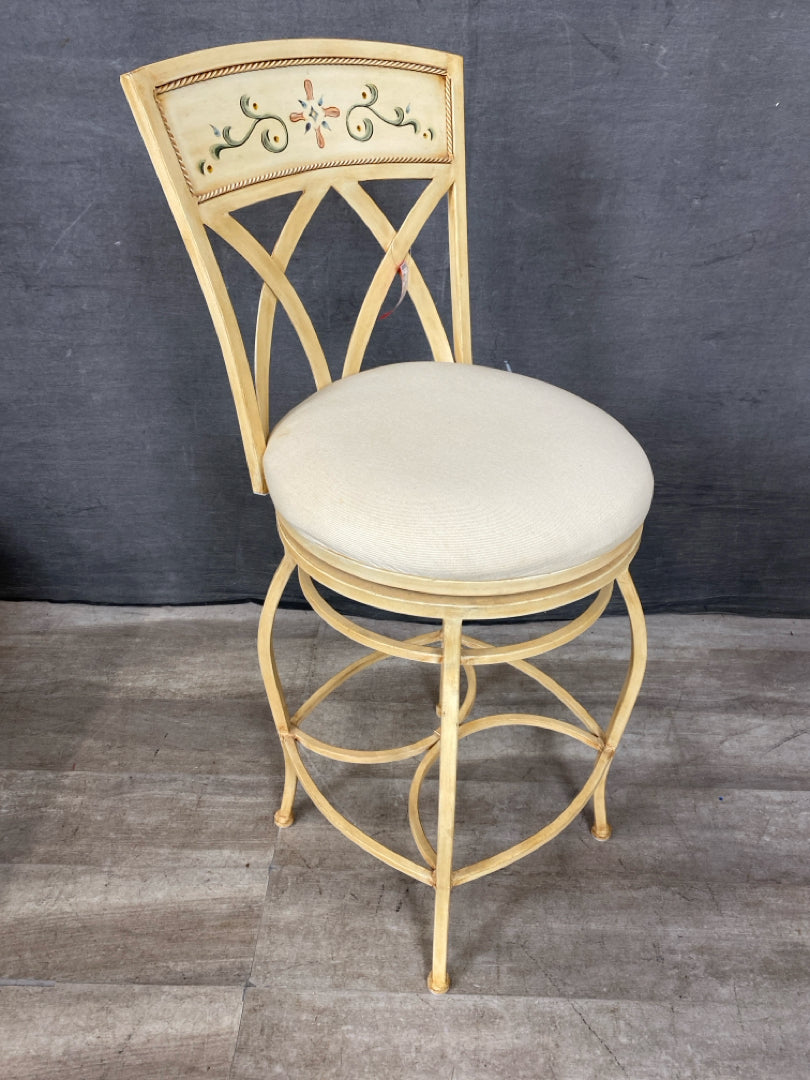 Bar Stool 26" Tall Swivel Ivory Metal with White Fabric Seat & Painted Top Back - 2 Available