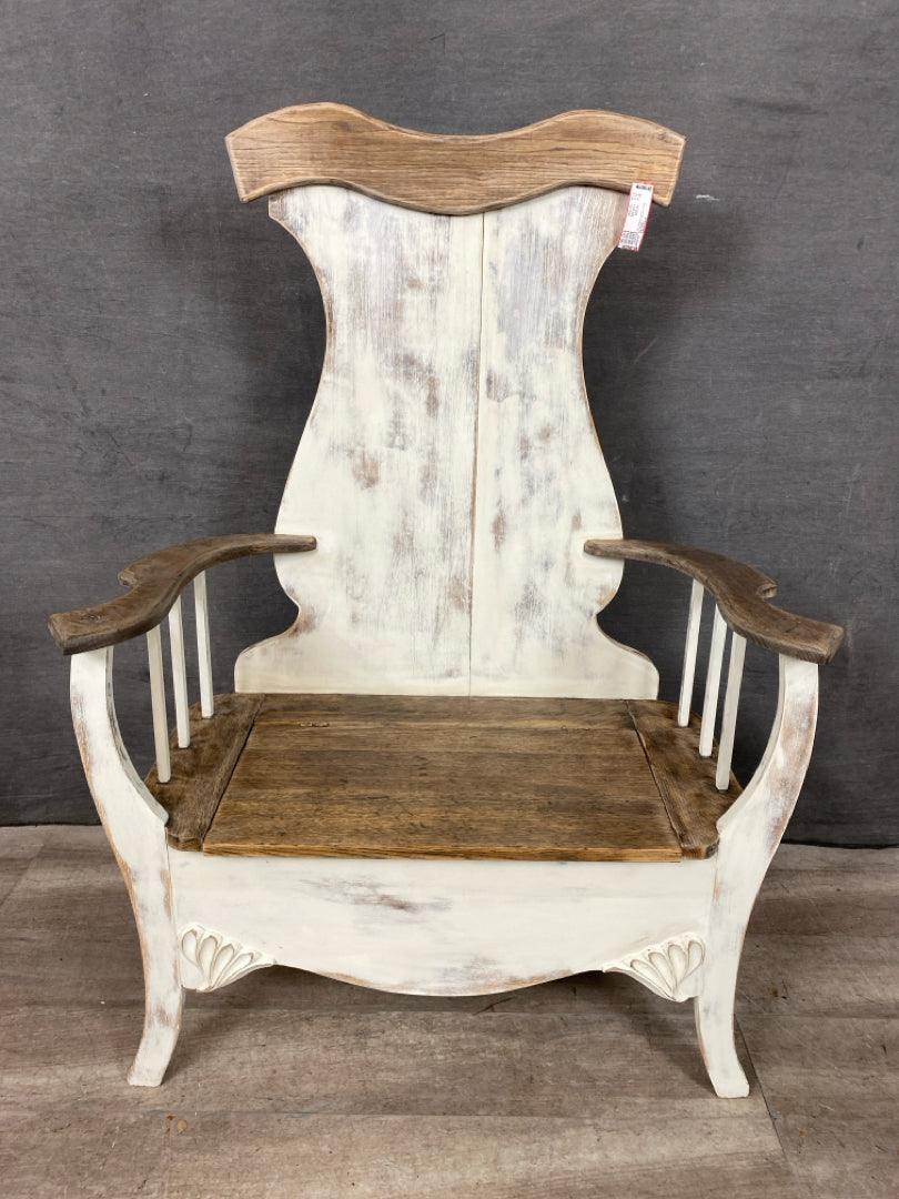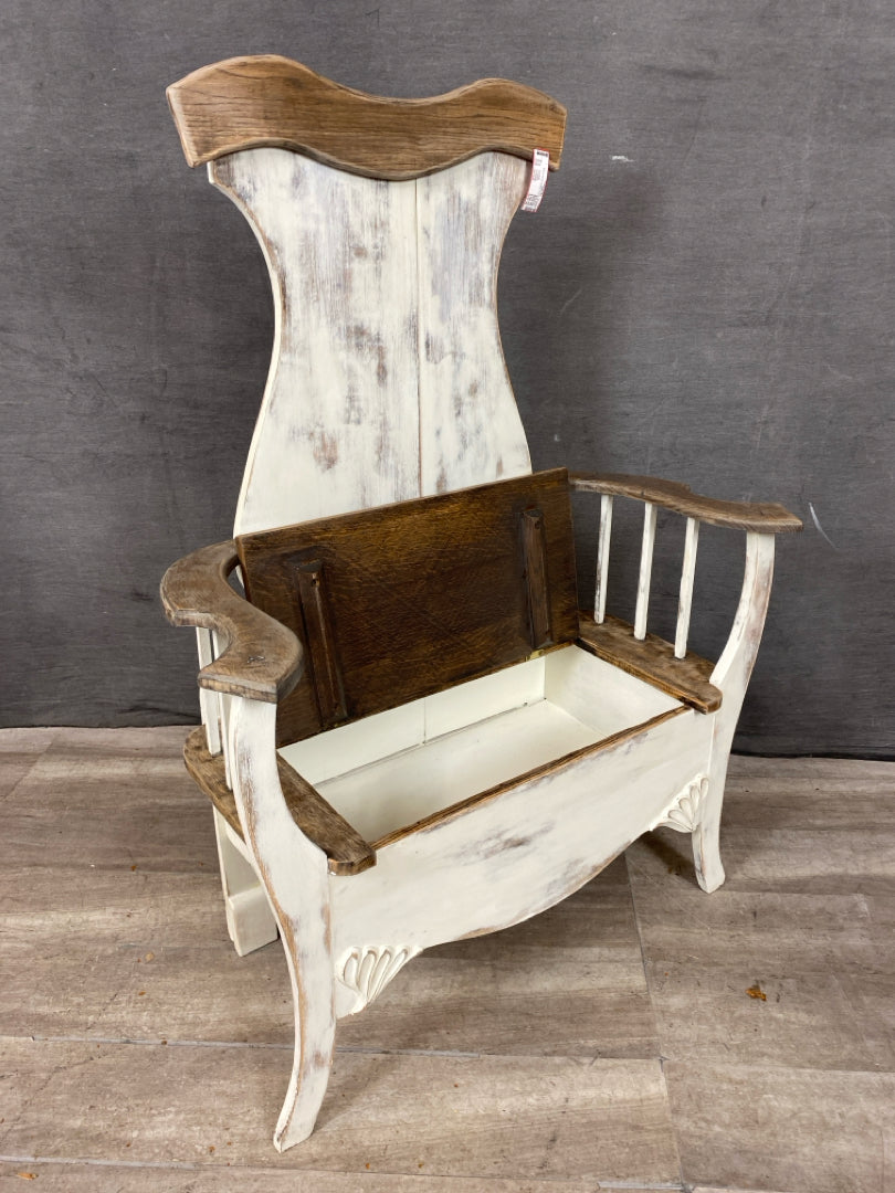 Bench 33x50" Shabby Chic White Wash with Medium Wood Scalloped/Bent Accents Spindle Sides & Storage