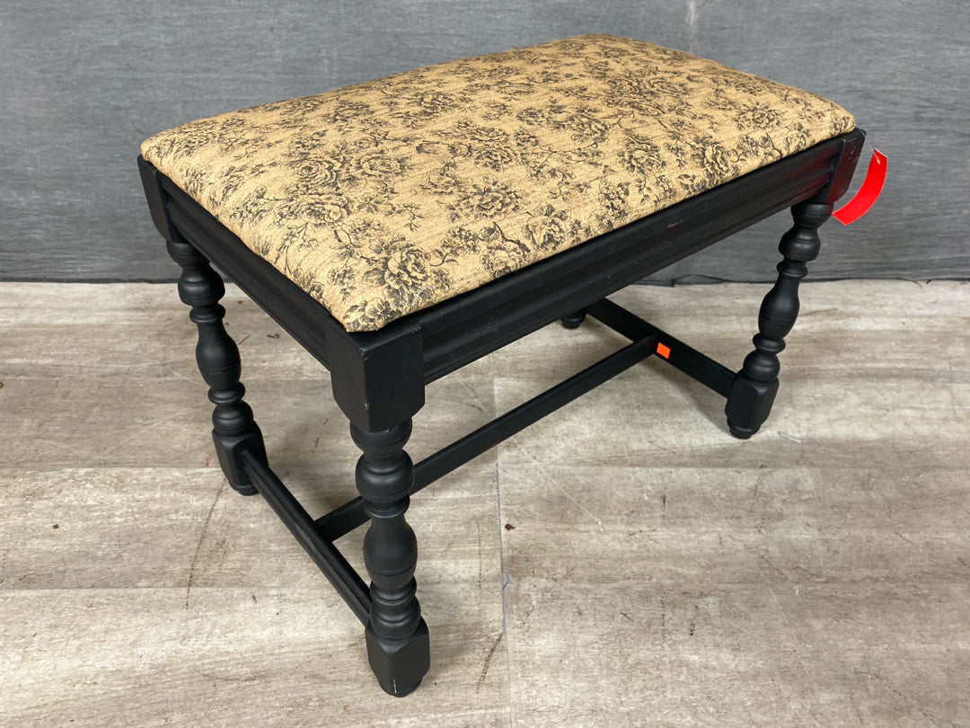 Bench 24" Wide Brown & Black Floral Fabric Top On Turned Black Wood Trestle Legs