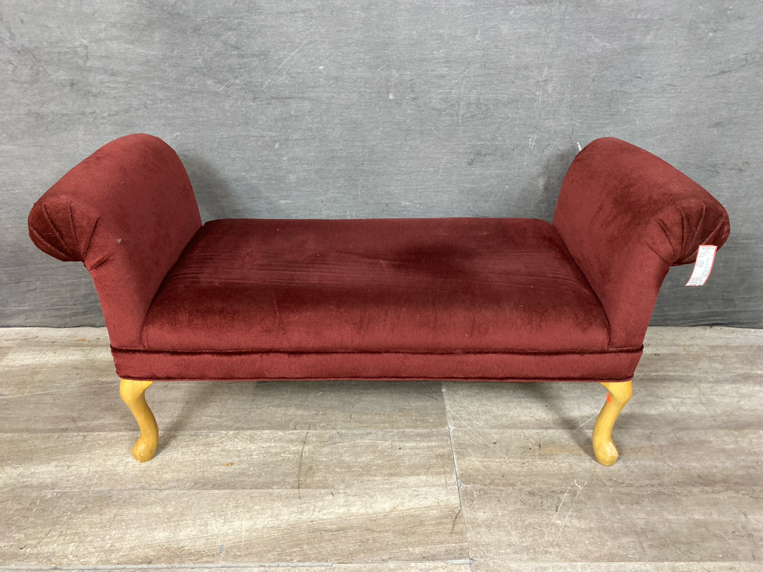 Bench 48" Wide Burgundy Fabric with Roll Arm Ends & Light Queen Anne Legs