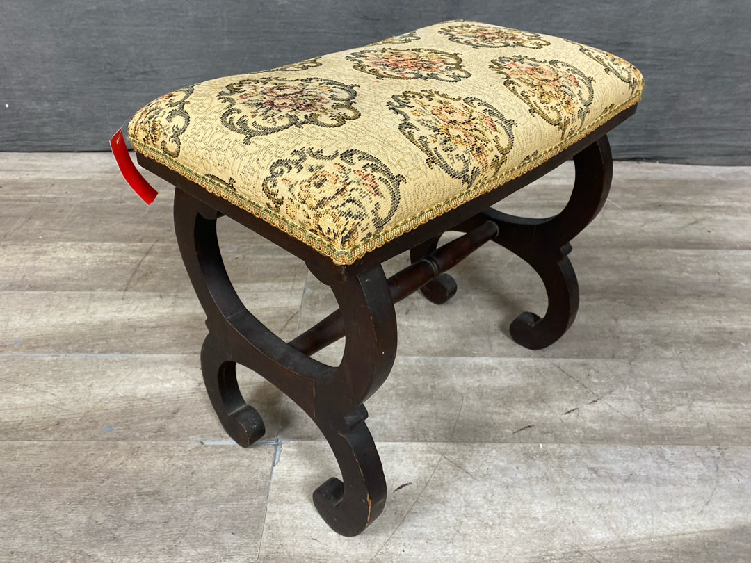 Bench Tan Floral Brocade Cushion On Dark Wood Scroll Legs