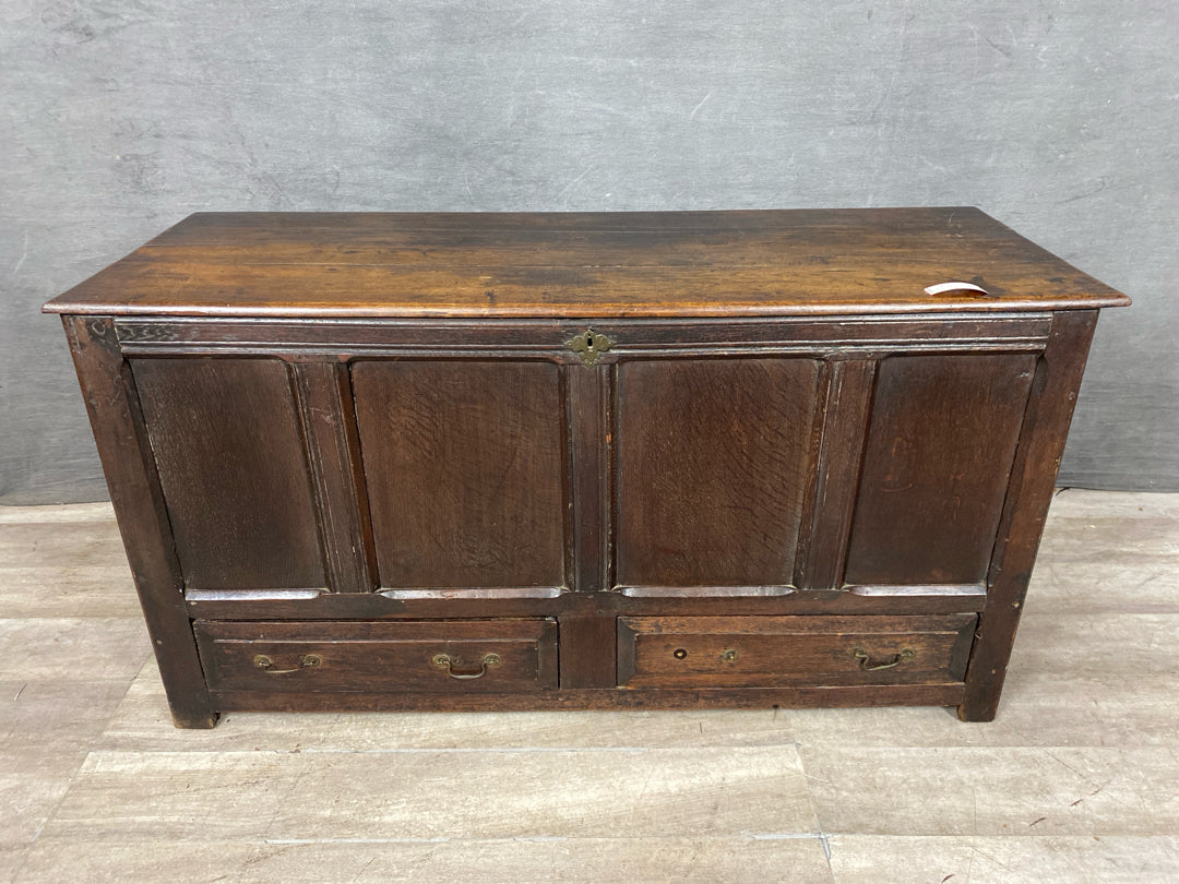 Chest 59x21x31" Large Antique Dark Wood Paneled Front Hinged Storage Lid & 2 Drawer Base (No Key)
