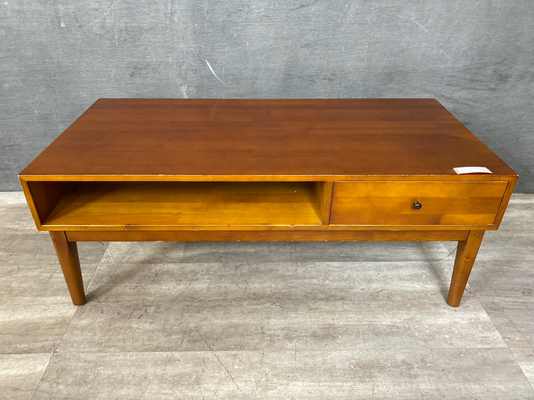 Coffee Table 22x47" Medium Wood Mid Century Modern Look with Pass Thru Drawer & Cubby