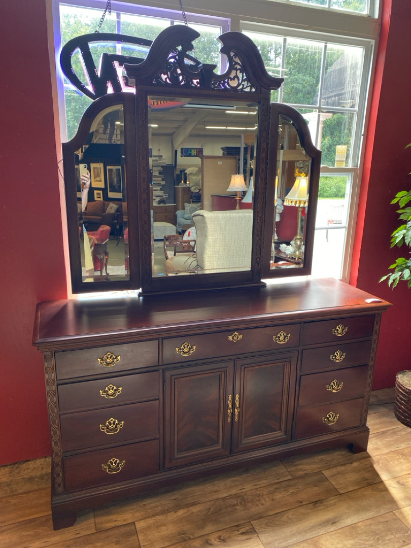American Drew Dresser with Mirror 67x19x36" Dark Wood Double 9 Drawer 2 Door with Double Arch Ornate Scroll Accent Beveled Mirror