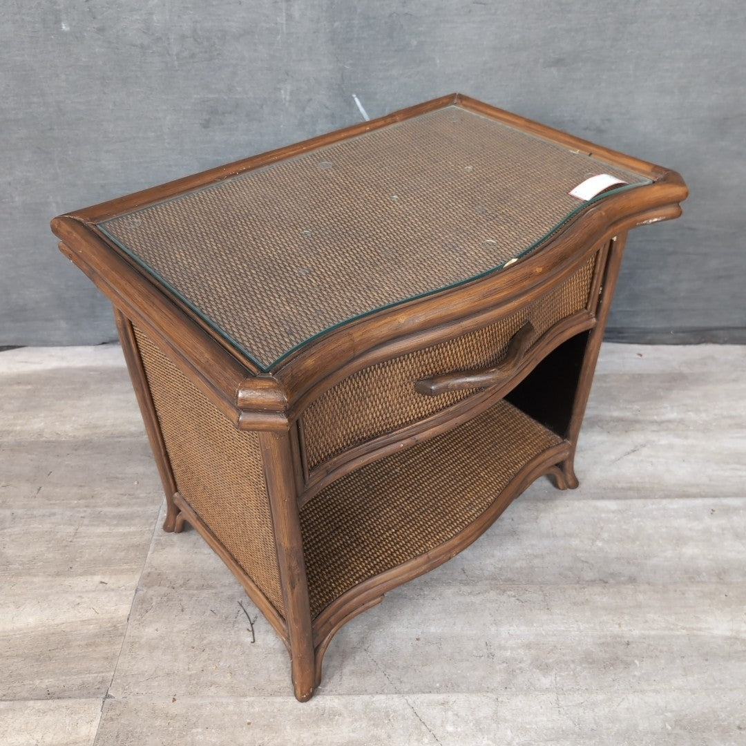 End Table 27x18x24" Scalloped Front Bend Wood 1 Drawer 1 Cubby With Woven Accent & Glass Top