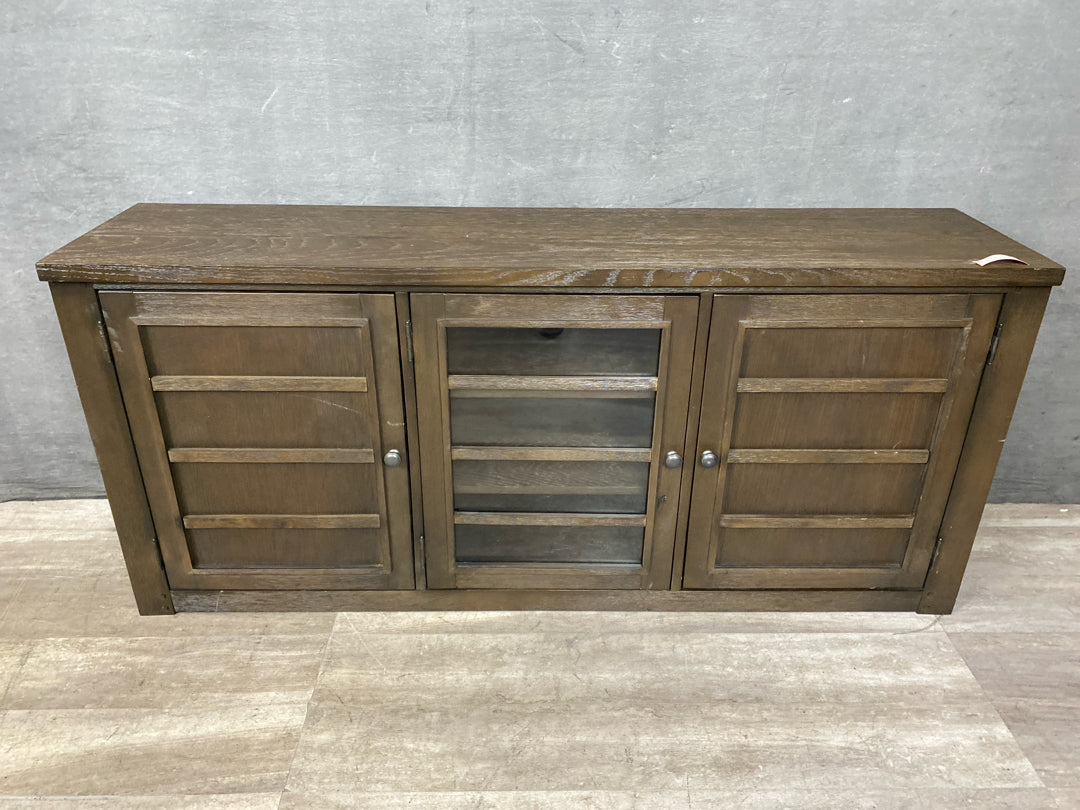 #Entertainment Center 65x30x15" Distressed Dark Wood 3 Door (1 Glass & 2 Wood Embossed Slats)