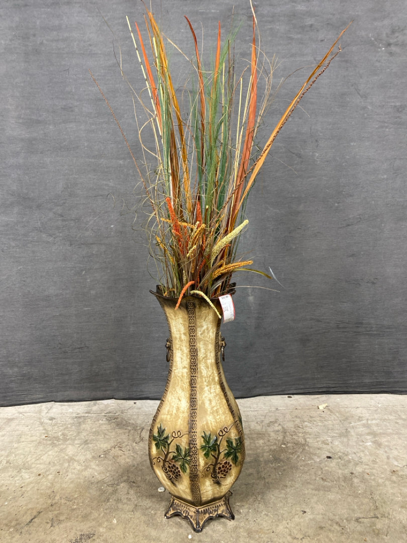 Floral Arrangement 50" Tall Twigs & Leaves In Tall Hexagonal Bulb Vase with Grapes Pattern