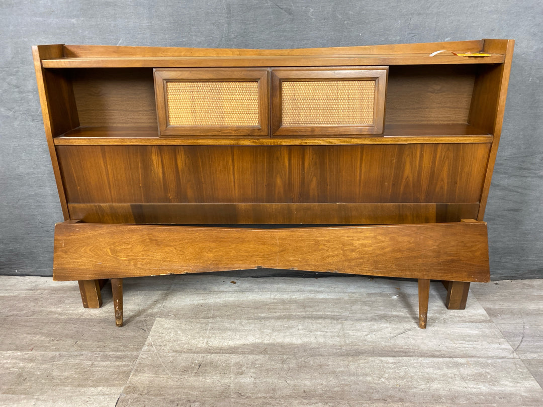 Full Bed Mid Century Dark Wood Compartment Headboard with Sliding Woven Doors & Bowtie Style Footboard Includes Headboard, Footboard & Rails
