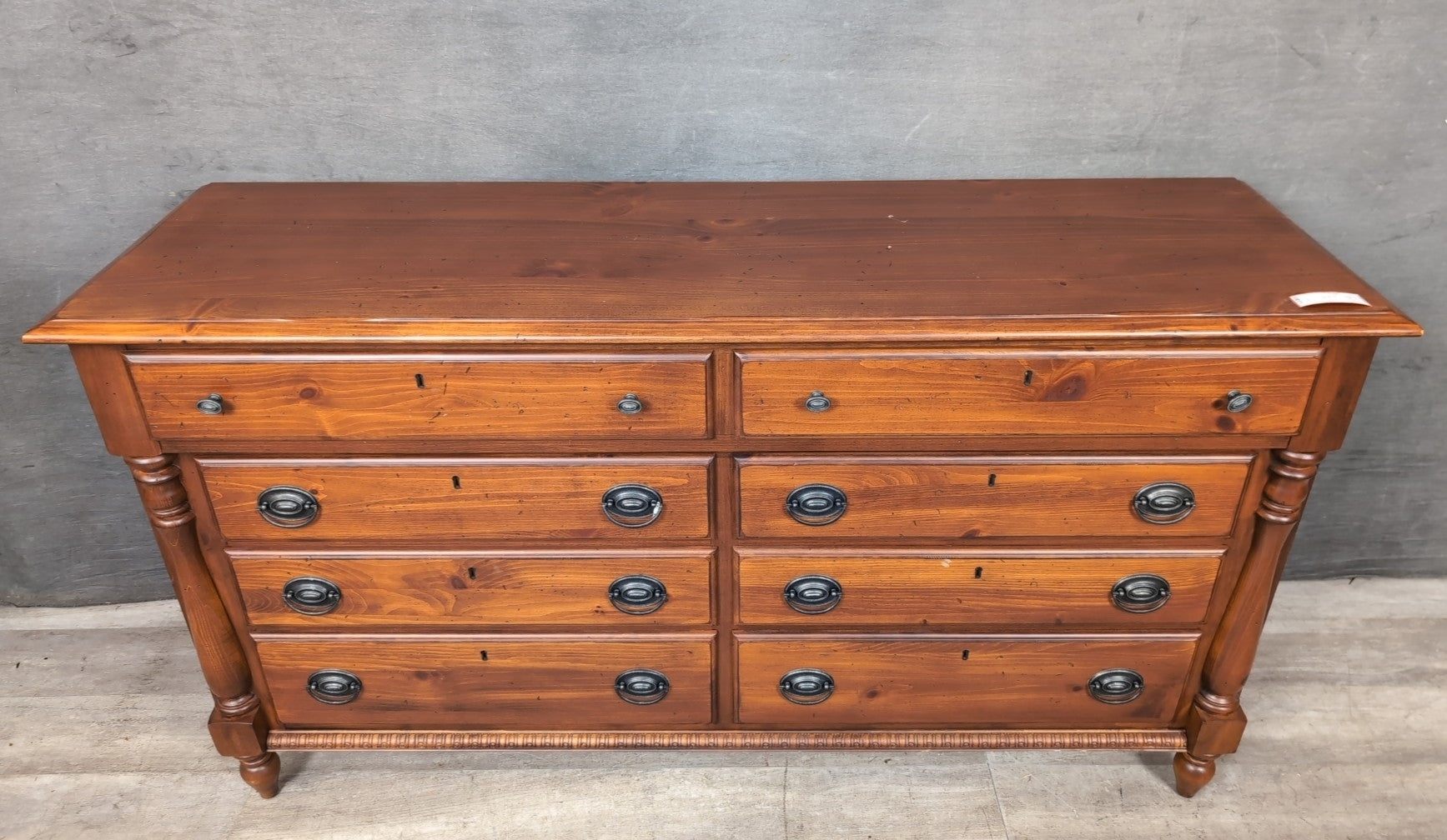 Kincaid Dresser 64x36x20" Dark Pine 8 Drawer Double with Turned Column Sides