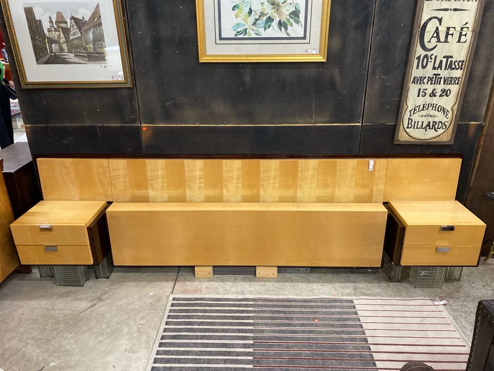 King Bed Platform 2 Tone Dark & Light Wood (Walnut & Maple?) Modern Lacquered with Floating Night Stands -Includes Headboard, Footboard, Rails, Slats & 2 Night Stands