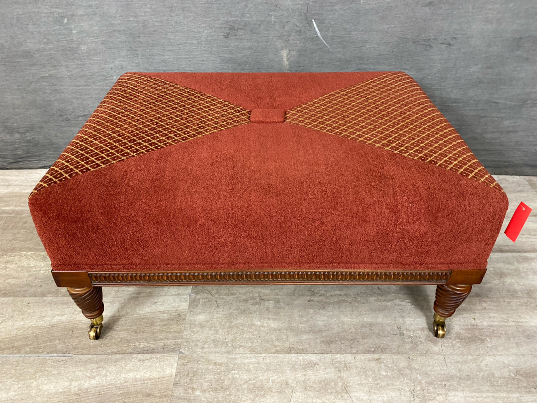 Kravet Ottoman 36x27" Rectangle Burgundy Fabric Gold Diamond Pattern On Carved Dark Wood Twisted Caster Feet