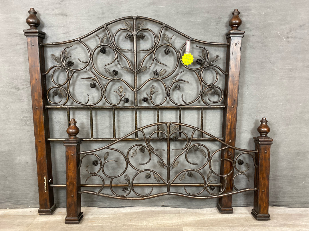 Queen Bed Dark Textured Metal Scroll & Pinecones with Dark Wood Square Post Sides & Finial Tops - Includes Headboard, Footboard, Rails & Slats