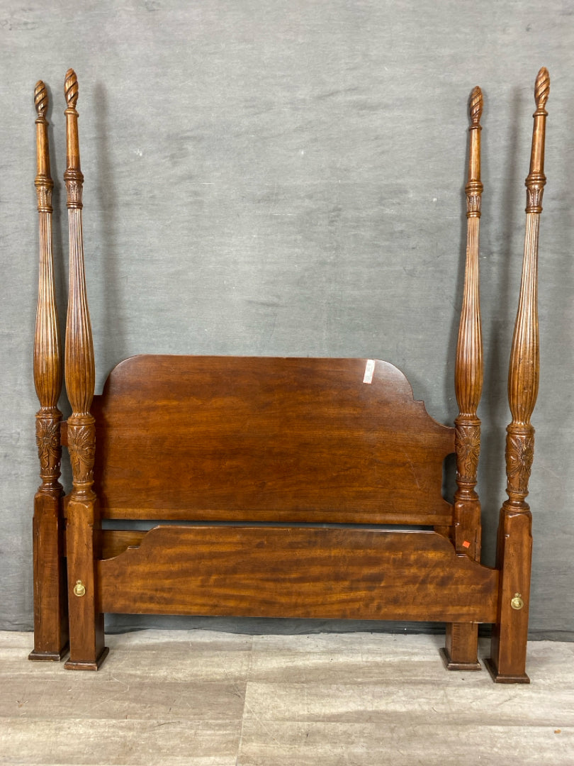 Queen Bed Dark Wood Ribbed Four Poster With Ornate Accents - Includes Headboard, Footboard, Rails & Slats