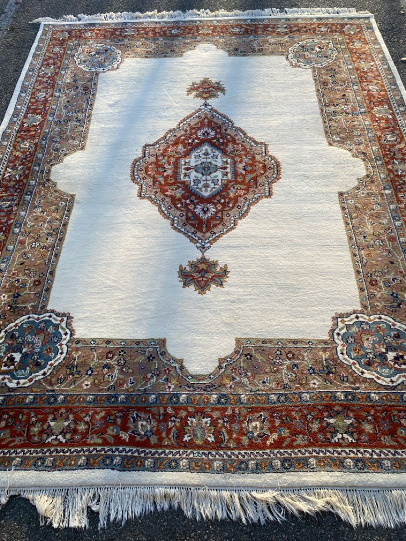 Rug 8x10' Wool White with Red Medallion & Border with Fringe Ends