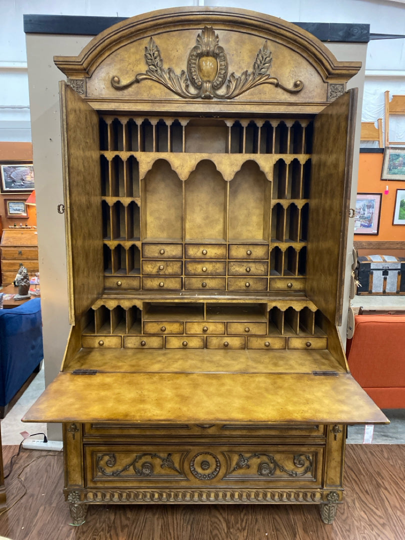 Secretary 2 Piece 54" Wide x 92" Tall Tan Wood with Drop Front, 2 Doors & 2 Drawers with Carved Vine/Leaf Scroll Accent