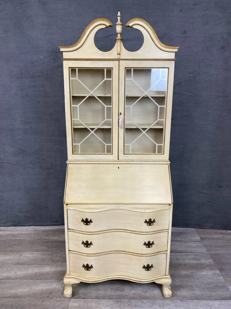 Secretary 31x17x78" Drop Front Ivory Wood with Gold Accents Glass Doors Broken Arch Finial Top On Double Bow Front 3 Drawer Base