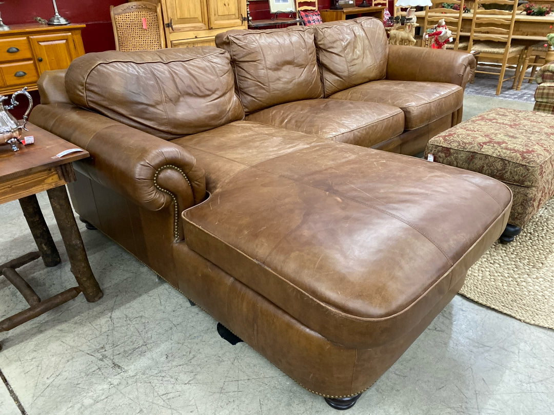 Bernhardt Sectional Sofa Brown Leather Roll Arm with Nailhead Accents & Chaise End