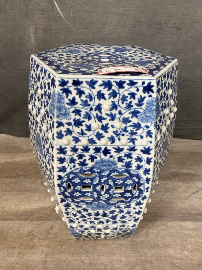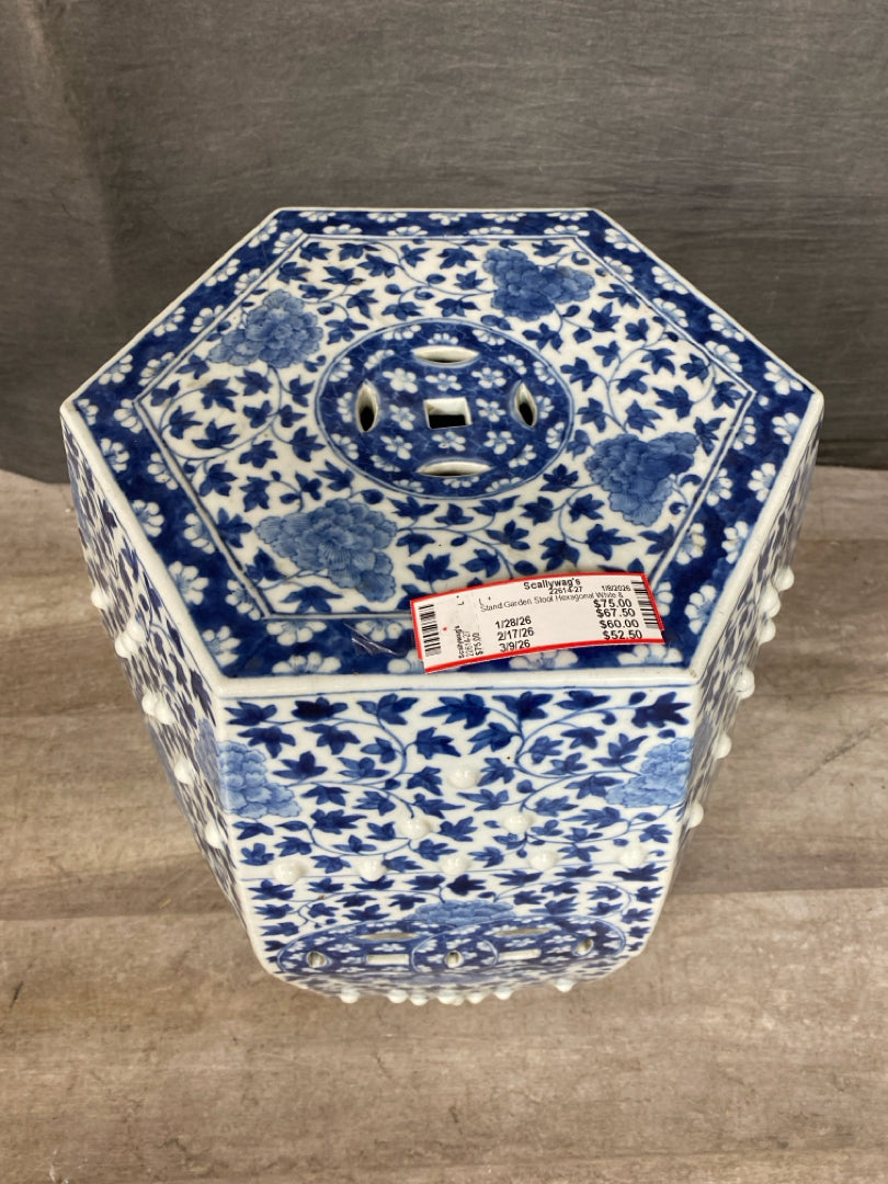 Stand Garden Stool Hexagonal White & Blue Ceramic Asian Floral Pattern