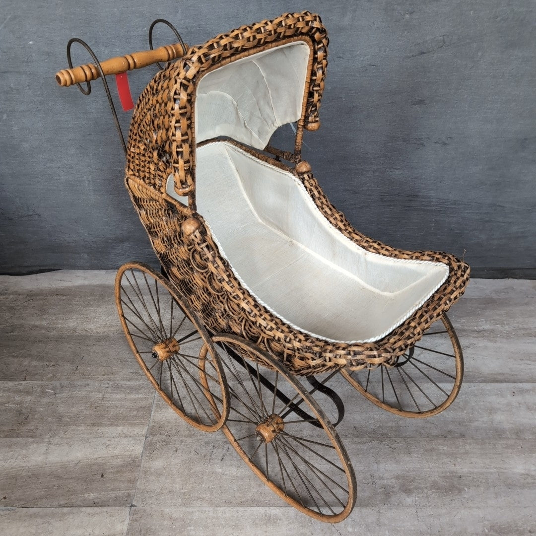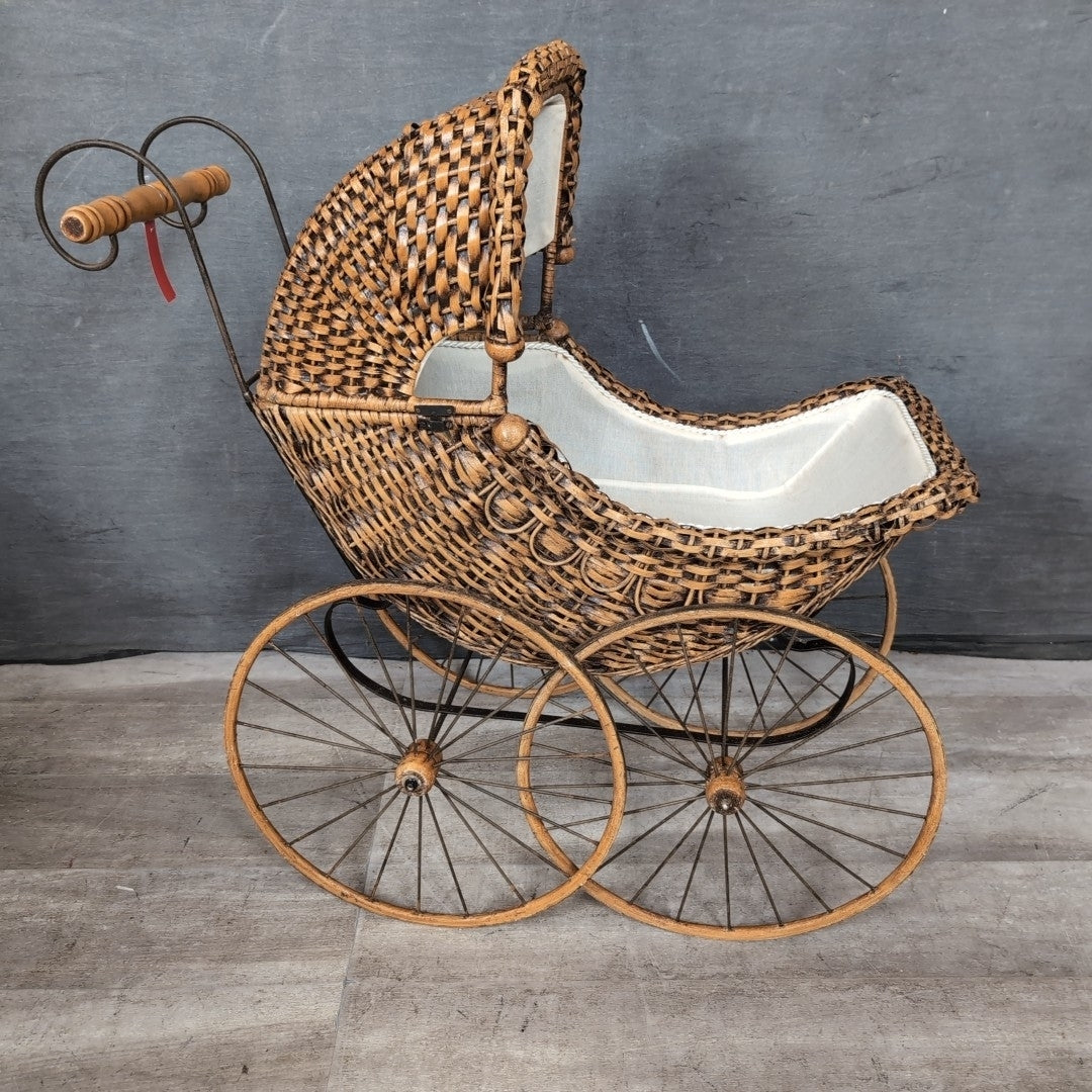 Toys Doll Carriage Woven Wicker On Spoked Wheels