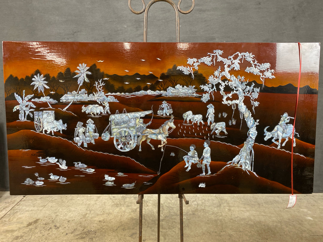 Wall Decor 47x23" Asian Style Brown Tones Lacquered Panel with Mother Of Pearl Asian Farmer Figures & Landscape