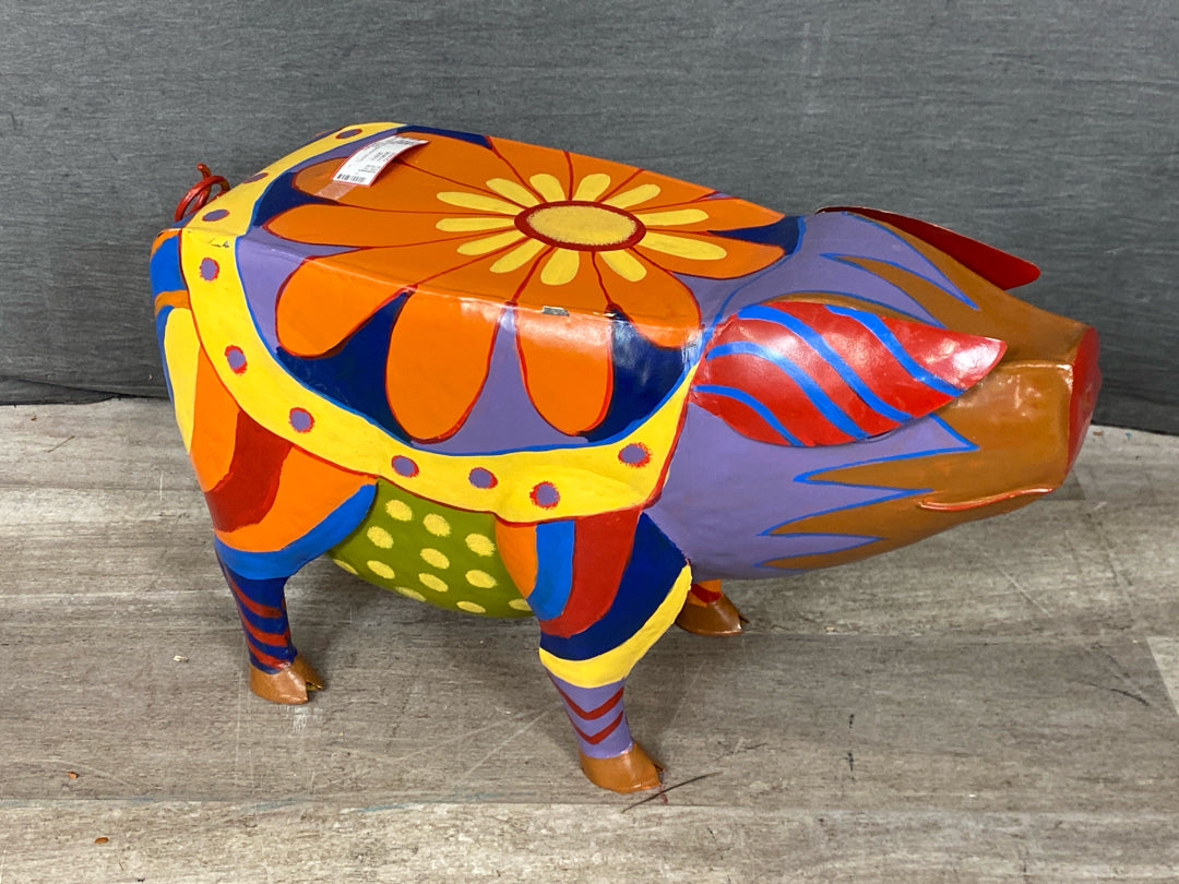 Yard Art Large Metal Pig Multicolor Painted Flower Back